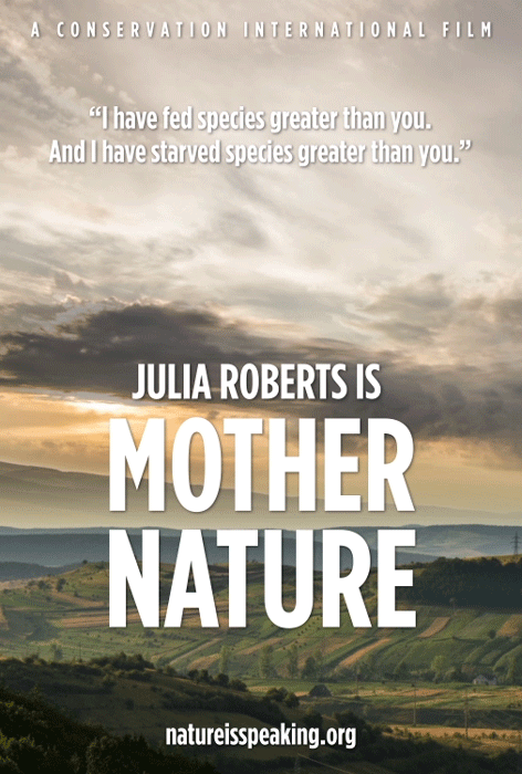 Conservation International has given a voice to Nature; which allows us to hear and see what Nature would say to us if it could. In the short films Nature reveals serious misgivings about the way humans are treating the Earth from the viewpoint of Mother Nature to The Ocean and The Rainforest. The voices that help Nature to speak are the voices we know very well from Julia Roberts, Harrison Ford, Kevin Spacey, Edward Norton, Penelope Cruz, and Robert Redford.They give voice and feelings to a planet which is hurting.