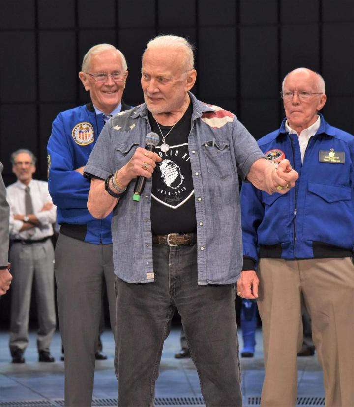Blue flight jackets. Highlighting the VIP guests was Buzz Aldrin Apollo 11 LMP, the second man to walk on the Moon after Neil Armstrong. Buzz was as full of energy tonight as when I spent quality time with him working a Bentley Continental GT event a decade ago. Buzz is now 89 and still brings energy and inspiration. For the 50th year celebration Buzz chose to go with the “Easy Rider” look of the youth in 1969.
